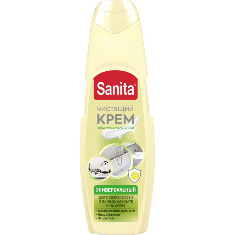Универсальное чистящее средство Sanita Сицилийский лимон крем 600 г. Назначение: плита, кафель, металлические и хромированные поверхности, нержавеющая сталь, серебро, мельхиор, фаянс, керамическая плитка, краны, посуда, рабочие поверхности. Способ применения: встряхните крем, распределите по поверхности с помощью влажной губки. Очистите, смойте водой. Используйте средство только на охлажденных керамических, эмалированных, стальных и других влагоустойчивых твердых поверхностях. Меры предосторожности: перед использованием ознакомиться с маркировкой продукта. Использовать перчатки и средства защиты лица и глаз. Использовать только в хорошо вентилируемом помещении. После работы тщательно вымыть руки. При попадании в глаза: осторожно промыть глаза водой в течение нескольких минут. Снять контактные линзы, если Вы ими пользуетесь и если это легко сделать. Продолжить промывание глаз. Если раздражение глаз не проходит, обратиться за медицинской помощью, по возможности показать маркировку продукта. При возникновении раздражения кожи обратиться за медицинской помощью, по возможности показать маркировку продукта. Хранить в недоступном для детей месте. Состав: lt; 5% щелочные добавки; lt; 5%: АПАВ и НПАВ; lt; 5%: консервант, краситель, ароматизирующая добавка. Условия хранения: Хранить при температуре от 0°С до +25°С в сухом месте. Предохранять от попадания прямых солнечных лучей. Срок годности: 4 года.