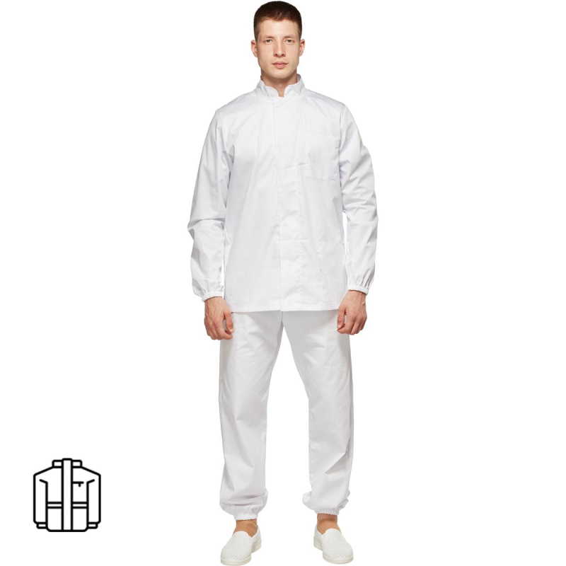 Белая мужская куртка прямого силуэта. Размер: 56-58. Рост: 182-188. Материла: смесовой ткань (50% хлопок, 50% полиэстер) плотностью 145 г/кв.м. Предназначена для ношения на пищевых предприятиях. Перед куртки с центральной потайной застежкой на кнопки до верха. Воротник-стойка. Втачной длинный рукав, с манжетой по низу, собранной на эластичную ленту. На левой полочке один боковой и один нагрудный потайные карманы с клапаном.