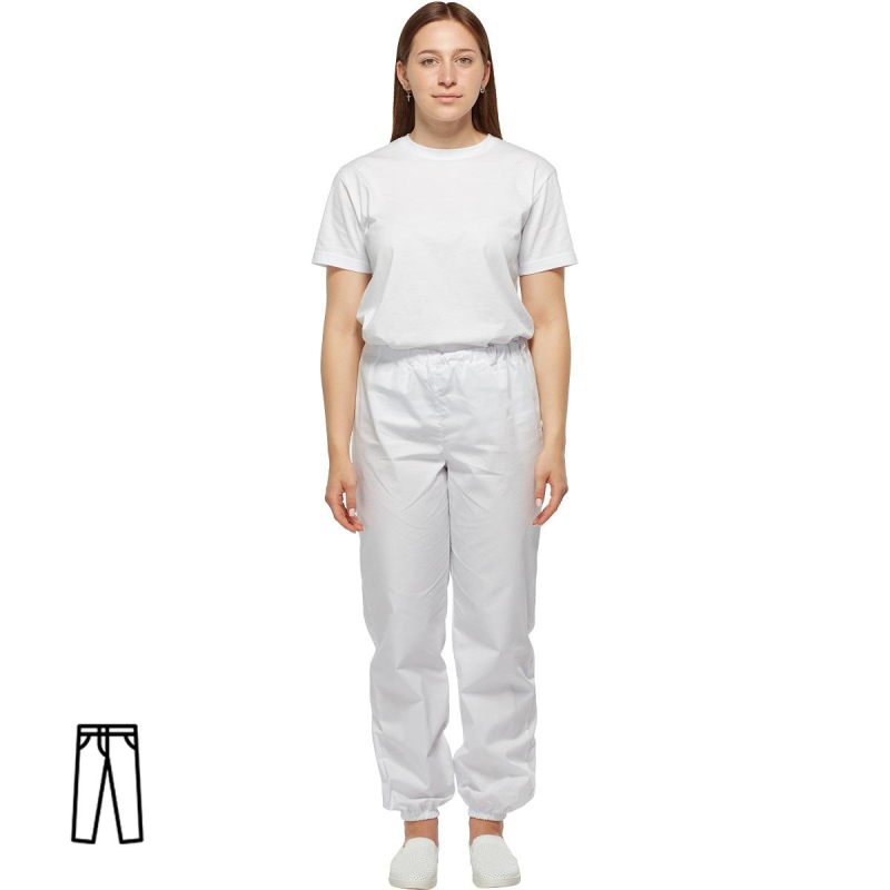 Белые брюки универсальные, изготовленные из смесовой ткани (50% хлопок, 50% полиэстер) плотностью 145 г/кв.м. Размер: 44-46. Рост: 182-188. Брюки с цельнокроеной обтачкой по верхнему краю и с манжетами по низу, собранными на эластичную ленту. Средний шов брюк усилен отстрочкой на 0,1 см. Ширина на поясе брюк регулируется шнурком, расположенным по внутренней стороне передней части пояса.