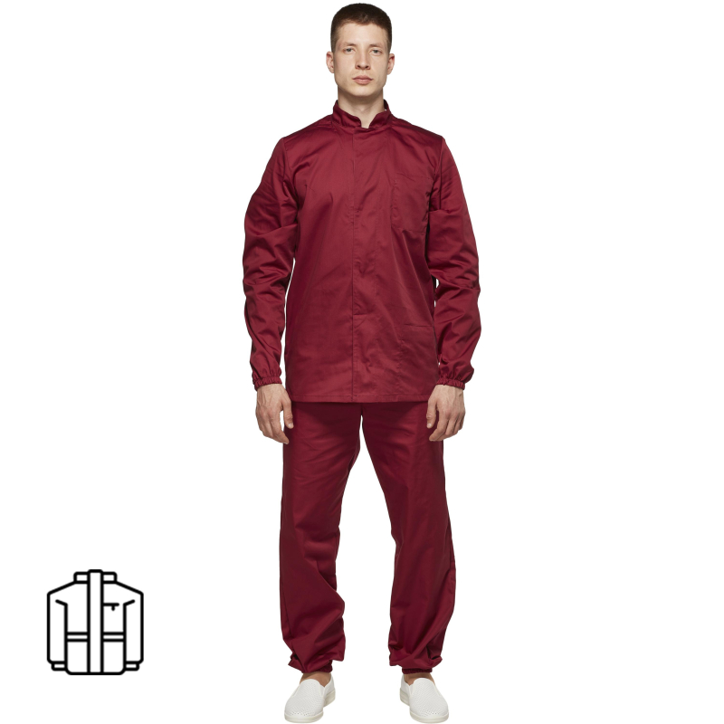 Бордовая мужская куртка прямого силуэта. Размер: 48-50. Рост: 182-188. Материла: смесовой ткань (50% хлопок, 50% полиэстер) плотностью 145 г/кв.м. Предназначена для ношения на пищевых предприятиях. Перед куртки с центральной потайной застежкой на кнопки до верха. Воротник-стойка. Втачной длинный рукав, с манжетой по низу, собранной на эластичную ленту. На левой полочке один боковой и один нагрудный потайные карманы с клапаном.