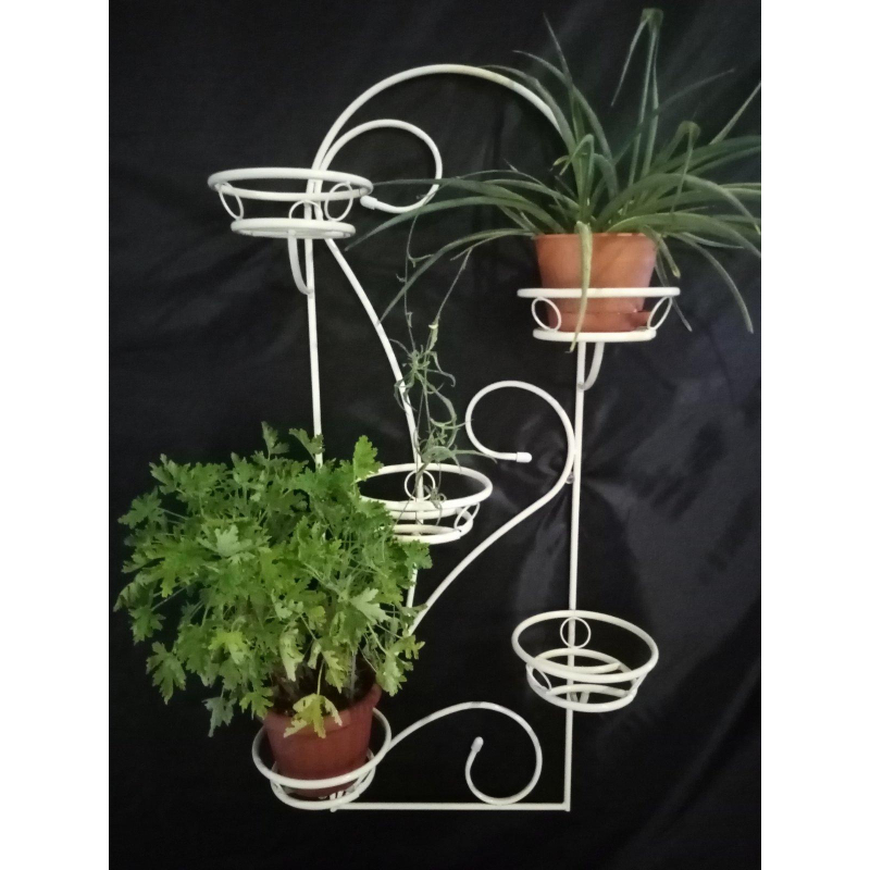 Подставка для цветов "Узорная" в цвете слоновая кость (белая) сделана из металлической трубы, порошковая покраска. Рассчитана на пять цветочных горшков. Рекомендованная нагрузка на каждую чашу под горшок 2.5-3.5 кг. Размер: 19x50x105 см.
