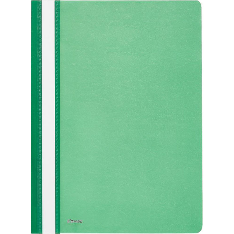 Скоросшиватель используется для хранения различного рода документации, для ведения документооборота, систематизации договоров, других важных бумаг. Папка изготовлена из гладкого пластика. Размер изделия составляет 230x309 мм, что чуть больше формата А4. Толщина верхнего прозрачного листа - 130 мкм, нижнего цветного листа - 180 мкм. С прозрачной верхней обложкой. На лицевой стороне находится карман с белым бумажной полосой для указания содержания, вместимость - 100 листов стандартной плотности. Цвет- зеленый.