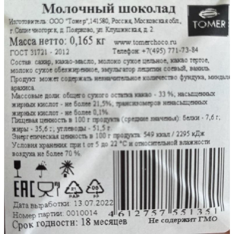 Молочный шоколад, порционный, пирамидки упакованные в двойной фант. Содержание какао не менее 33%. Вес: 165 г. Пищевая ценность: белки - 7,6 г, жиры - 35,6 г, углеводы - 51,5 г. Энергетическая ценность: 549 ккал. Срок годности: 18 месяцев. Условия хранения от +5°С до +22°С и относительной влажности воздуха не более 70%. Страна производства: Россия.