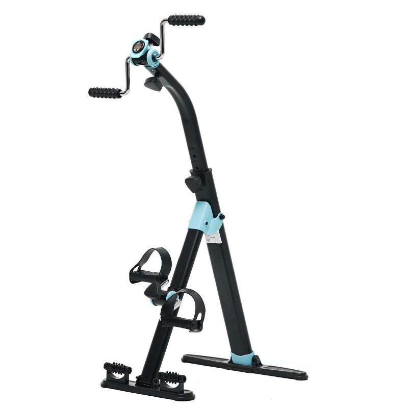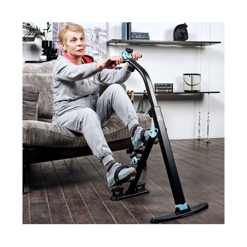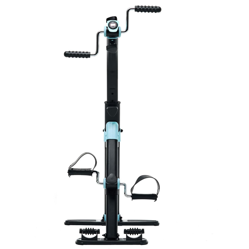 Велотренажер двойной DFC B812 dual bike. Велотренажер двойной DFC B812 dual bike Велотренажер DFC B812 dual bike предназначен для домашнего использования. Его основное назначение - реабилитация после операций и травм, тренировки для пожилых и людей с ограниченными физическими возможностями. Характеристики: - Корпус выполнен в классическом черном цвете, который дополняют яркие голубые вставки. - Трубочная система регулируется вручную при помощи рукоятей на педальном блоке и блоке руля. Для увеличения нагрузки необходимо поворачивать рукоятку по часовой стрелке, для снижения нагрузки - против часовой стрелки. - Заниматься на тренажере можно стоя или сидя, что оптимально для занятий сидячим людям. Максимально допустимый вес пользователя - 100 кг. - В основании тренажера предусмотрены ролики с пупырчатой поверхностью для массажа ног. Такими же накладками оснащены рукоятки. - Монохромный дисплей отображает время занятия, число шагов, скорость, калории. В комплект входит батарейка 1.5 В (необходима для работы дисплея).