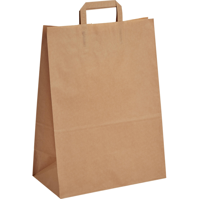 Пакет бумажный с плоскими ручками 32x17x43 см по 200 штук в упаковке. Крафт-пакет бумажный с плоскими ручками - отличное решение для услуги с собой/навынос или на доставку. Гигиеничный и безопасный продукт. Производится по международным стандартам качества. Благодаря плотной бумаге обладает высокой прочностью и отлично держит форму. Выдерживает вес до 5 кг. Пригоден для вторичной переработки.