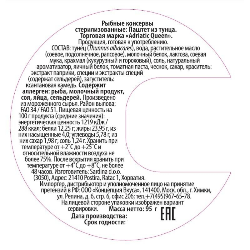 Паштет из тунца - обязательная закуска любого праздничного стола, идеально сочетается с поджаренными тостами или теплым пивным хлебом. Изготовленный из тунца паштет сохраняет полезные свойства этой рыбы-обладает антиоксидантными свойствами, укрепляет кости и повышает иммунитет. Является источник витаминов группы B, A, E, D, аминокислот, микроэлементов (железо, калий, магний, селен, фосфор), полезных жирных кислот Омега-3 и Омега-6. Состав: тунец (Thunnus albacares), вода, растительное масло (соевое, подсолнечное, рапсовое), молочный белок, лактоза, соевая мука, крахмал (кукурузный и гороховый), соль, натуральный ароматизатор, яичный белок, томатная паста, чеснок, сахар, краситель: экстракт паприки, специи и экстракты специй (содержат сельдерей), загуститель: ксантановая камедь. Содержит аллерген: рыба, молочный продукт, соя, яйца, сельдерей. Пищевая ценность в 100 г: белки - 12,25 г, жиры - 23,95 г, углеводы - 5,78 г. Энергетическая ценность в 100 г: 228 ккал. Срок годности: 48 месяцев. Хранить при температуре от +2°C до +25°С и относительной влажности воздуха не более 75%. После вскрытия хранить при температуре от +4°C до +8°C, не более 48 часов. Страна происхождения: Хорватия.
