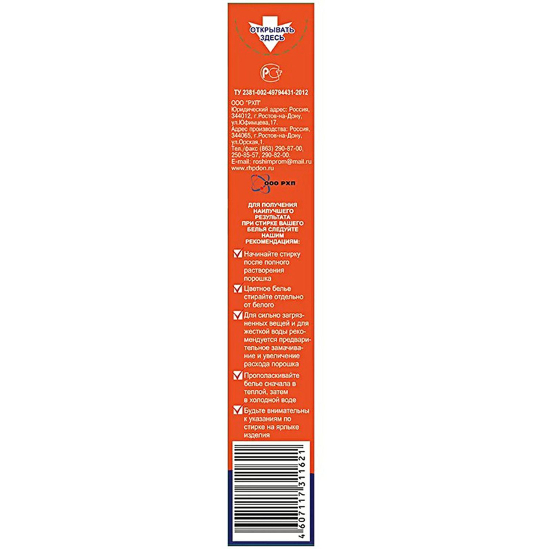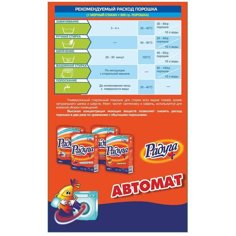Порошок стиральный автомат Радуга Автомат 450 г. Назначение: универсальный стиральный порошок для использования в автоматических стиральных машинах, стиральных машинах активаторного типа и ручной стирке. Содержит оптический отбеливатель и умягчитель воды (фосфаты). Подходит для чистки стен, полов, плитки и эмалированных изделий. Придает льну цитрусовый свежий аромат. Смывает все виды пятен. Высокая концентрация моющих средств позволяет снизить расход порошка вдвое по сравнению с обычными порошками. Способ применения: начинайте стирку после полного растворения порошка (подробная информация о дозировке указана на упаковке). Цветное белье стирайте отдельно от белого. Для сильно загрязненных вещей и для жесткой воды рекомендуется предварительное замачивание и увеличение расхода порошка. Прополаскивайте белье сначала в теплой, затем в холодной воде. Будьте внимательны к указаниям по стирке на ярлыке изделия. Меры предосторожности: хранить вдали от пищевых продуктов. Состав: сульфат натрия 30% и более, ПАВ 5-15%, триполифосфат натрия до 10%, карбонат натрия до 15 %, карбоксиметилцеллюлоза натрия до 10%, оптический отбеливатель до 0,2%, ароматизатор до 0,2 %. Условия хранения: хранить в сухом помещении, предохраняя от влаги и прямых солнечных лучей, при температуре от -10 до +40°С, при относительной влажности до 95%. Срок годности: 24 месяца с даты изготовления. Относится к сегменту "суперэконом" - товар с минимальными требованиями к качеству для тех, кто хочет сэкономить. Товар отвечает основным потребительским характеристикам.