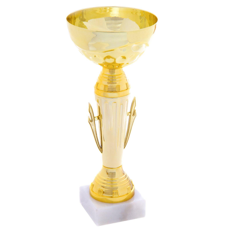 Кубок Золото спортивный металл/пластик/камень (высота 19 см). Кубок может быть вручен на тематическом или корпоративном мероприятии в качестве знака внимания или может быть приурочен к любому торжеству. Размер кубка: 19x8x8 см; Материал основания: пластик; Материал чаши: металл; Диаметр чаши: 8 см; Размер цоколя: 2x5x5 см; Материал цоколя: прессованная мраморная стружка.