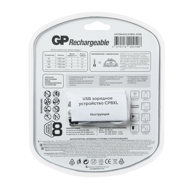 Зарядное устройство GP 270AAHC/CPBXL-2CR8 для 8-ми аккумуляторов (в комплекте 8 аккумулятора AA емкостью 2700 мАч) Внешний вид и/или характеристики товара могут быть изменены производителем в соответствии с производственным процессом.