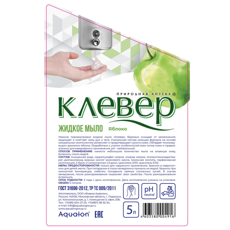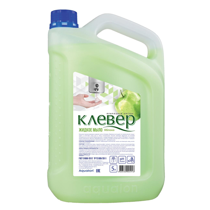 Мыло жидкое Клевер Яблоко 5 л. Назначение. Нежное перламутровое жидкое мыло "Клевер" бережно очищает от загрязнений, защищает и смягчает кожу рук и тела. Уникальная мягкая моющая формула на основе натуральных компонентов увлажняет и предотвращает сухость кожи. Обладает тонизирующим ароматом яблока. Разработано с учетом особенностей всех типов кожи и предназначено для ежедневного применения. pH-нейтрально. Меры предосторожности. Хранить в недоступном для детей месте. При попадании в глаза промыть большим количеством воды. Только для наружного применения. Состав. Очищенная вода, лауретсульфат натрия, хлорид натрия, этиленгликольдистеарат, диэтаноламид жирных кислот кокосового масла, лимонная кислота, парфюмерная композиция, 2-бром-2-нитропропан-1,3-диол, краситель Е133, краситель Е102. Условия хранения. Хранить при комнатной температуре, избегать попадания прямых солнечных лучей. В случае замерзания после размораживания сохраняет свои свойства. После размораживания встряхнуть. Срок годности: 3 года с даты изготовления.