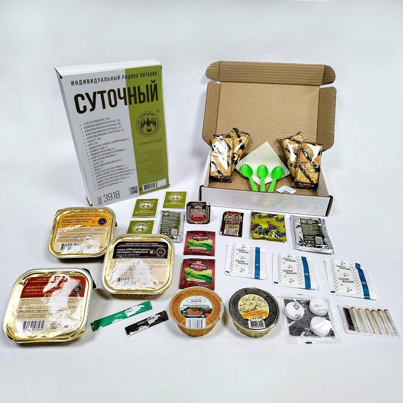 ИРПС (индивидуальный рацион питания - суточный) сухой паек, является классическим рационом питания для питания одного человека в течение суток (завтрак, обед, ужин). В составе сухого пайка представлено все необходимое: консервированные блюда, галеты, портативный разогреваетель, средства гигиены и обеззараживания воды, столовые приборы и многое другое. Энергетическая ценность: 3918 ккал. Срок годности: 22 месяца. Состав: консервы мясорастительные-750 г, консервы овощные закусочные-100 г, паштет-100 г, концентрат напитка тонизирующий-25 г, сливки сухие-5 г, повидло фруктовое-45 г, кофе натуральный растворимый-2 г, чай черный байховый-4 г, сахар-60 г, соль поваренная пищевая-5 г, перец черный молотый-1 г, разогреватель портативный- 1к-т, спички водоветроустойчивые-6 шт, средство для обеззараживания воды-3 шт, ложка пластмассовая одноразовая-3 шт, салфетки дезинфицирующие-3 шт, салфетки бумажные-3 шт, галеты армейские из муки пшеничной-200 г, соус томатный острый-30 г.