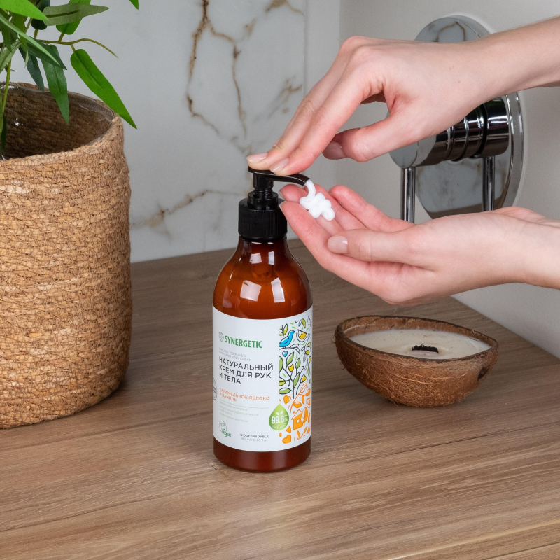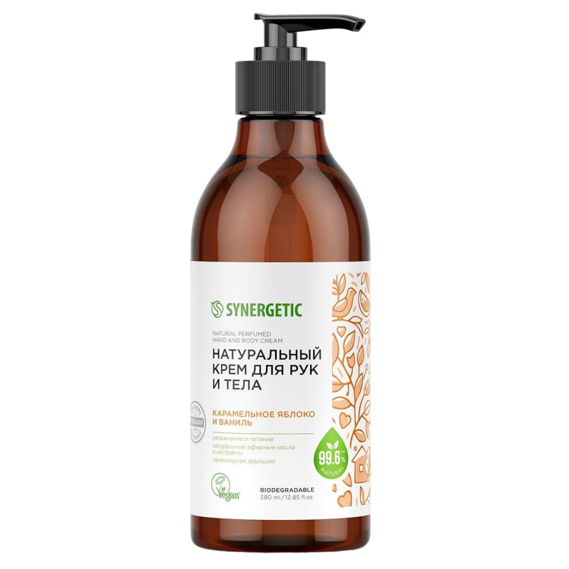 Натуральный крем для рук и тела Synergetic Карамельное яблоко и ваниль 380 мл. Обеспечивает эффективное увлажнение и дарит коже ощущение комфорта. Активные компоненты крема в сочетании с изомератом сахарида восстанавливают естественный водный баланс и улучшают внешний вид кожи, препятствуя потере влаги. Комплекс натуральных масел ши, кокоса, сладкого миндаля и экстракт яблока оказывают регенерирующее действие, интенсивно питают и смягчают кожу, делая ее гладкой и бархатистой. Бисаболол и масло авокадо восстанавливают барьерные функции кожи и успокаивают, а экстракт ванили защищает от негативного воздействия внешней среды. Натуральный пребиотик трегалоза нормализует и сохраняет естественный микробиом кожи. Парфюмерная композиция с натуральными эфирными маслами померанца, корицы и лимона оставляет на коже волнующий аромат. Натуральный крем дерматологически протестирован независимым институтом в Германии. Он не содержит силиконов, парабенов, минеральных масел, красителей, компонентов животного происхождения, не тестируется на животных и сертифицирован британской организацией The Vegan Society. Знак Vegan - мировой стандарт этичной продукции. Способ применения: нанести массирующими движениями на чистую сухую кожу. Состав: Aqua, Glycerin (растительный увлажнитель), Caprylic/Capric Triglyceride (смягчающий кожу эмолент на основе пальмового и кокосового масел), Butyrospermum Parkii Butter (масло карите), Cetearyl Alcohol (натуральный эмульгатор), Glyceryl Stearate (натуральный эмульгатор), Potassium Cetyl Phosphate (увлажняющий эмульгатор, структурообразователь), Behenyl Alcohol (натуральный загуститель), Stearic Acid, Palmitic Acid (натуральный эмульгатор, смягчающий компонент), Pyrus Malus Juice (экстракт яблока), Vanilla Planifolia Fruit Extract (экстракт ванили), Trehalose (натуральный полисахарид, пребиотик), Bisabolol (натуральный противовоспалительный компонент), Persea Gratissima Oil (масло авокадо), Cocos Nucifera Oil (масло кокоса), Sweet Almond Oil Polyglyceryl-4 Esters (водорастворимое масло миндаля), Saccharide Isomerate (увлажняющий актив), Undecane, Tridecane (натуральный эмолент), Sorbitan Caprylate (натуральный эмульгатор), Propanediol (увлажняющий компонент), Benzoic Acid (природный консервант), Polyglyceryl-10 Laurate (натуральный стабилизатор эмульсий), Xanthan Gum (ксантановая камедь), Parfum (отдушка), Potassium Hydroxide (регулятор кислотности), Sodium Benzoate, Potassium Sorbate (природные консерванты), Citric Acid, Sodium Citrate. Меры предосторожности: при попадании в глаза, промыть водой. Только для наружного применения. Оберегать от детей и животных. Хранить отдельно от еды. Хранить при температуре от +5 до +25°С вдали от нагревательных приборов и огня. Не допускается хранение под непосредственным воздействием солнечного света. Срок годности: 36 месяцев с даты производства при соблюдении условий хранения.