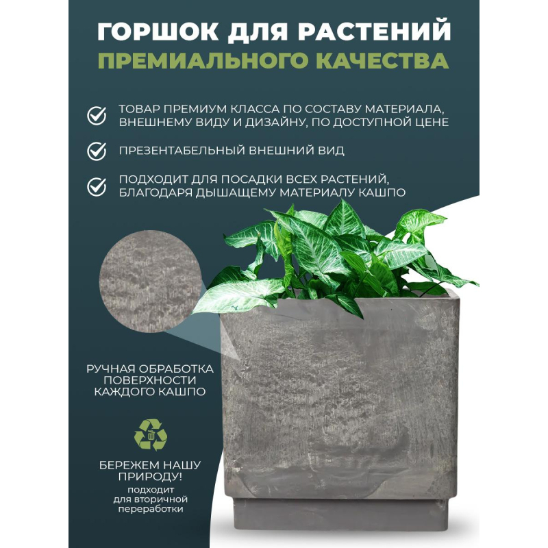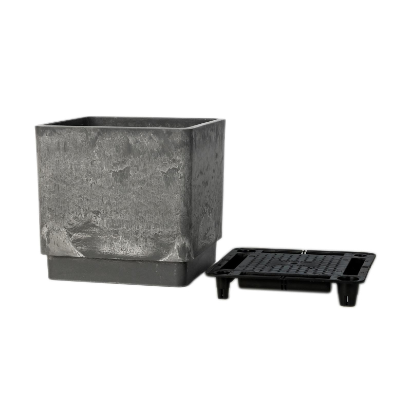 Горшок для растений квадратной формы бренда GreenShip серого цвета, имеет оригинальную текстуру "под камень", которая создается при ручной обработке поверхности. Комплектация: Присутствует дренажный вкладыш, который защищает растения от избытка воды и обеспечивает вентиляцию корней растения. Материал: Изготовлен из ударопрочного специализированного пластика в состав которого входит битый камень, древесная мука с полимерами. Растениям в нем комфортно, так как он "дышащий". Область применения: Для дома и улицы. Эксплуатация: При температуре от -45 до +65 градусов по Цельсию. Особенности: - Подлежит вторичной переработке. - Подлежит сверлению (при желании можно сделать дренажные отверстия). - Устойчивость к плесени, грибку, гниению и коррозии - это свойство выгодно отличает пластик от других материалов, подверженных этим процессам. - Экологически безопасный. Изделия не выделяют в атмосферу и почву вредные вещества, поэтому полностью безопасны. Объем: 6.5 л. Размер: 20.8x20.8x20 см.