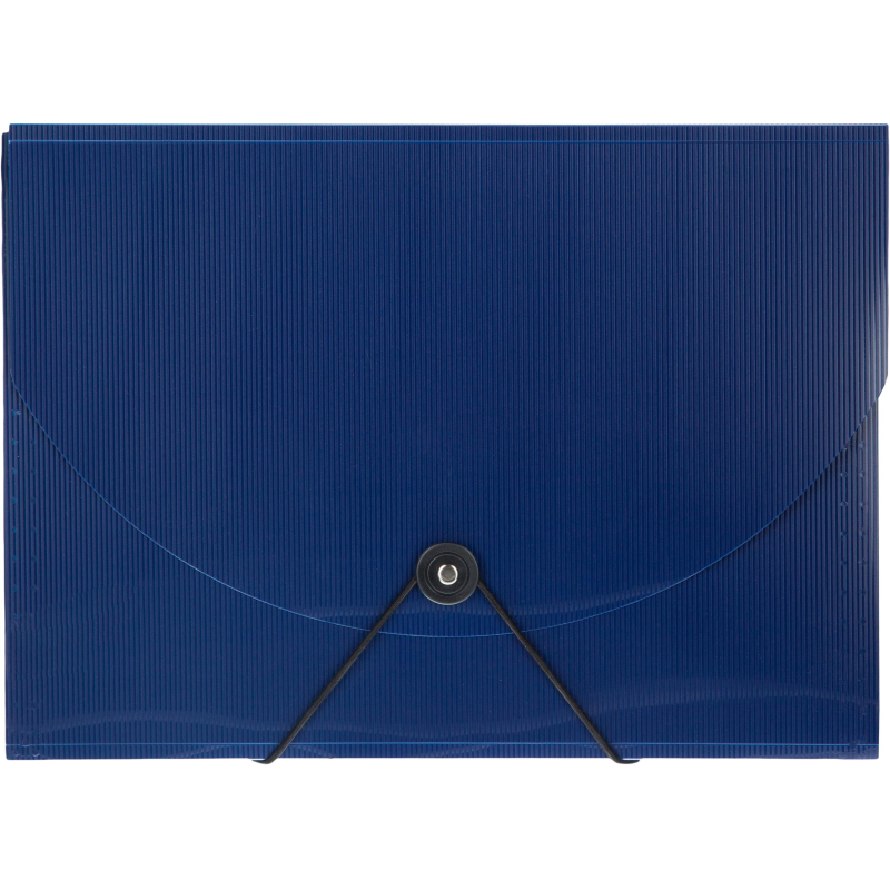 Изготовлена из полипропилена толщиной 0,7 мм. Имеется 12 внутренних отделений. Закрывается на эластичную резинку. Формат А4. Ширина папки 35 мм. Цвет синий.