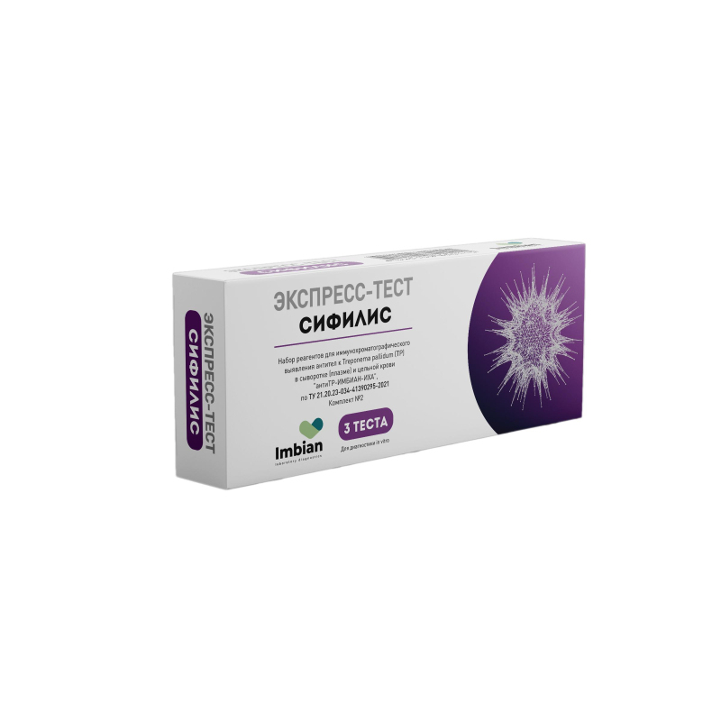 Набор реагентов для иммунохроматографического выявления антител к Тreponema pallidum (ТР) в сыворотке (плазме) и цельной крови "антиТР-ИМБИАН-ИХА", по ТУ 21.20.23-034-41390295-2021. Срок годности 24 месяца. Комплектация: Пачка карт., тест-кассета 3 шт., буфер для анализа (4 мл) 1 шт., пипетка 3 шт., скарификатор 3 шт.