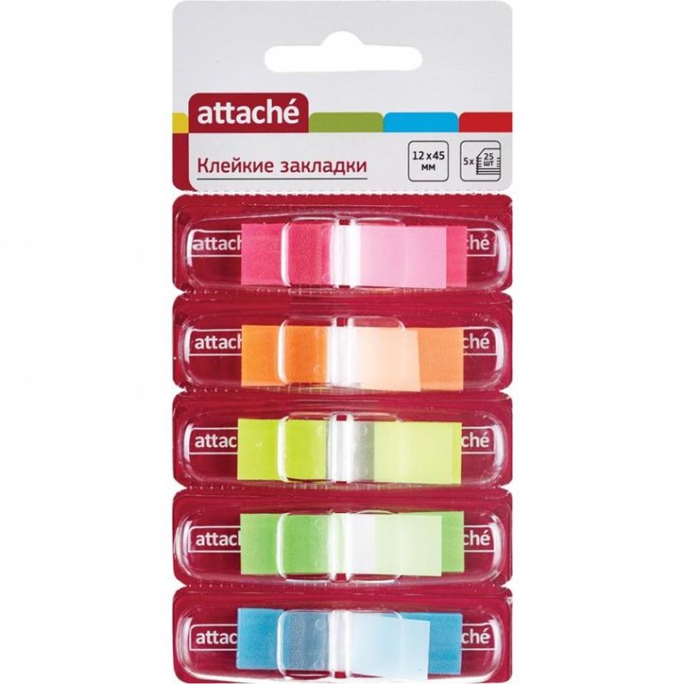 Самоклеящиеся закладки ярких неоновых цветов. Каждый цвет расположен в отдельном мини-диспенсере, возможно отделение каждого мини-диспенсера друг от друга. Клейкие закладки предназначены для выделения информации. На них можно наносить надписи. Клеевой край предназначен для многократного переклеивания. В процессе отклеивания не повреждает бумагу. Клейкие закладки расположены в мини-диспенсере, который позволяет моментально подготовить к работе следующую закладку. Цвета: розовый, оранжевый, желтый, зеленый, голубой.