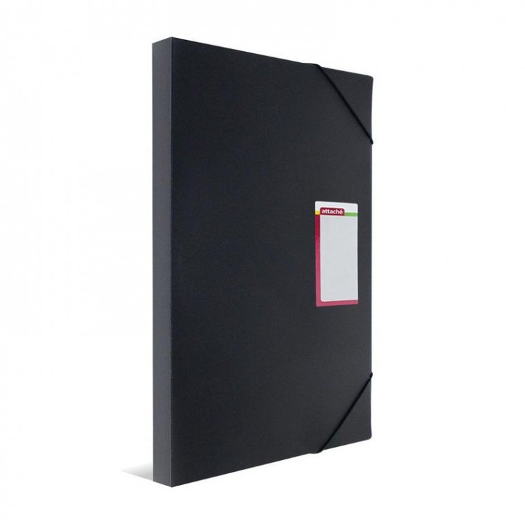 Папка-короб на двух резинках Attache формата А3 выполнена из пластика, толщиной 0,8 мм, черного цвета. Оснащена двумя угловыми резинками, которые надежно удерживают ее в закрытом состоянии. Имеет три боковых клапана, благодаря чему документы не выпадают. Вмещает до 300 листов стандартной плотности. На обложке — этикетка для маркировки.