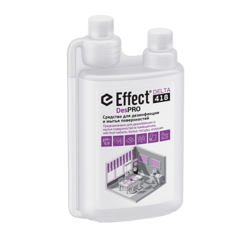 Дезинфицирующее средство Effect DesPro 418 1 л Назначение: средство предназначено для мытья и дезинфекции поверхностей в помещениях, жесткой мебели, поверхностей приборов и оборудования, кувезов, санитарно-техничекого оборудования, белья, посуды (в том числе одноразовой, лабораторной), игрушек, предметов ухода за больными, предметов личной гигиены, резиновых и полипропиленовых ковриков, обуви из полимерных материалов, спортивного инвентаря, медицинских отходов и текстильных и др. материалов, жидких отходов и выделений, уборочного инвентаря, систем мусороудаления. Места применения: можно использовать в медицинских организациях любого профиля, в очагах инфекционных заболеваний, микробиологических и других лабораториях, на станциях переливания крови и скорой помощи, аптеках, на коммунальных объектах, в организациях культуры, отдыха и спорта, образовательных учреждениях, учреждениях социального обеспечения, на предприятиях общественного питания и торговли, предприятиях фармацевтической и биотехнической промышленности по производству нестерильных лекарственных средств в помещениях классов чистоты А. Способ применения. Обработка поверхностей в помещениях, жесткой мебели - протереть тканевой салфеткой, смоченной в растворе. Не ранее, чем через 30 минут смыть водой. Для борьбы с плесенью - поверхность очситить с помощью щетки. Обработать 50% раствором поверхность дважды с интервалом 15 минут. Детские игрушки - мелкие игрушки полность погрузить в емкость с раствором средства, крупные игрушки - протеретт тканевой салфеткой, смоченной в растворе. Через 15 минут промыть водой. Посуда кухонная, столовая, чайная - освободить от остатков пищи, погрузить в раствор из расчета 2 л на 1 комплект. Через 5 минут промыть водой. Белье - замочить в растворе из расчета 5 л на 1 кг сухого белья. не ранее, чем через 60 минут белье постирать, прополоскать до исчезновения пены. Состав: дидецилдиметиламмониум хлорид 2.7%, полигексаметиленгуанидин гидрохлорид 0.7%, N,N-(3-аминопропил) додециламин 0.7%, вспомогательные компоненты. Срок годности: 36 месяцев с момента производства (при соблюдении условий хранения рекомендованных производителем).