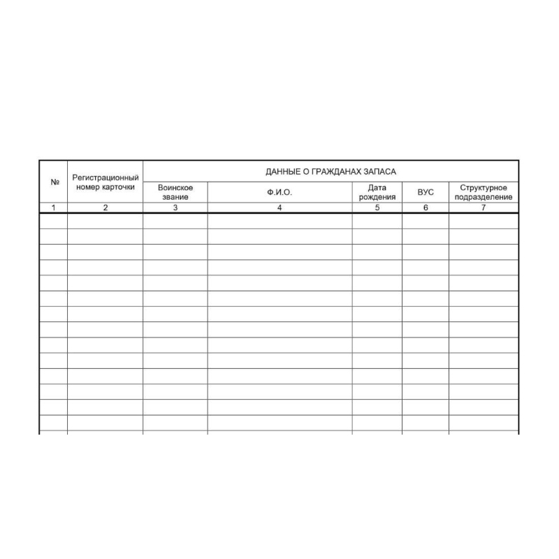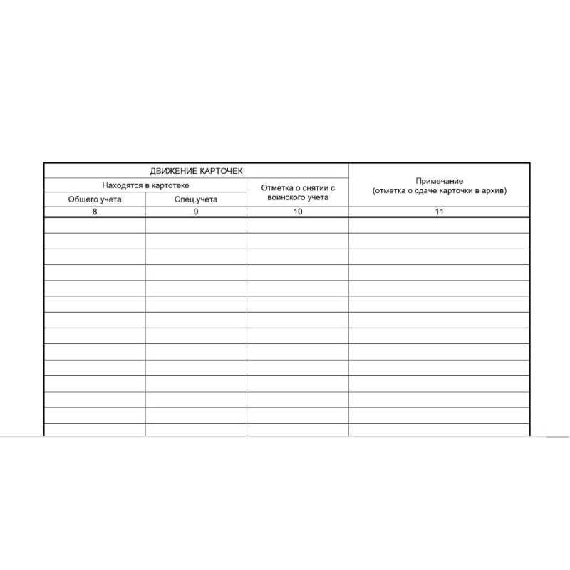 Журнал учета карточек граждан, подлежащих воинскому учету (форма № 10) применяется для ведения воинского учета в организации, соответствует "Инструкции об организации работы по обеспечению функционирования системы воинского учета" (утв. приказом Министра обороны РФ от 22 ноября 2021 г. N 700). Журнал создан в соответствии с нормативными документами: Приложение N 5. Журнал учета личных карточек формы Т-2 (Т-2ГС) на граждан РФ, пребывающих в запасе; Методические указания по организации и ведению воинского учета и бронирования граждан Российской Федерации, пребывающих в запасе, и работающих в исполнительных органах государственной власти Санкт-Петербурга и организациях Санкт-Петербурга, деятельность которых связана с деятельностью указанных органов или которые находятся в сфере их ведения. Журнал содержат следующие графы: 1. Порядковый номер записи; 2. Регистрационный номер карточки. Данные о гражданах запаса: 3. Воинское звание; 4. ФИО; 5. Дата рождения; 6. ВУС; 7. Структурное подразделение. Движение карточек: 8. Находятся в картотеке общего учета; 9. Находятся в картотеке специального учета; 10. Отметка о снятии с воинского учета. 11. Примечание (отметка о сдаче карточки в архив). Журнал должен быть зарегистрирован, пронумерован, прошнурован, опечатан и заверен подписью руководителя организации. Формат: A4 (210x290 мм). Материал обложки - картон. Внутреннего блок - офсетная белая бумага, плотность бумаги 80 г/кв.м, 32 листа. Журнал опломбирован номерной голографической пломбой. Обложка - золотистый картон. Дополнительно съемная обложка из прозрачного ПВХ.