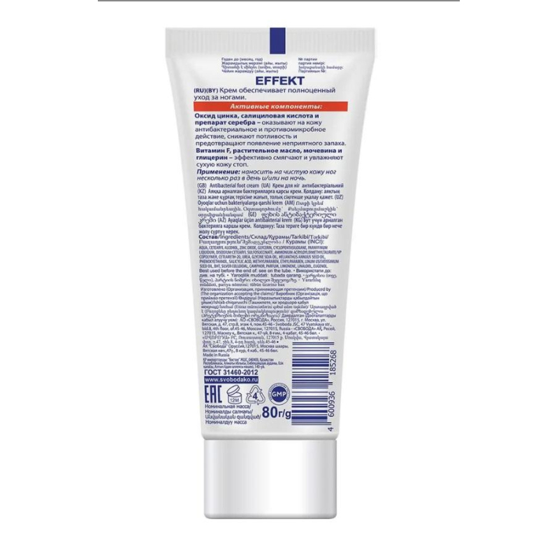 Крем для ног Эффект 'Антибактериальный', 80 г. Обеспечивает полноценный уход за ногами. Активные компоненты: Оксид цинка и препарат серебра - оказывают на кожу антибактериальное и противомикробное действие, снижают потливость и предотвращают появление неприятного запаха; Витамин F, растительное масло, мочевина и глицерин - эффективно смягчают и увлажняют сухую кожу стоп. Состав: Aqua, Glycerin, Olus Oil, Glyceryl Stearate, Stearic Acid, Potassium Cetyl Phosphate, Cetearyl Alcohol, Aesculus Hippocastanum Extract, Quercus Robur Bark Extract, Artemisia Vulgaris Extract, Triethanolamine, Phenoxyethanol, Methylparaben, Ethylparaben, Parfum, Limonene, Linalool.