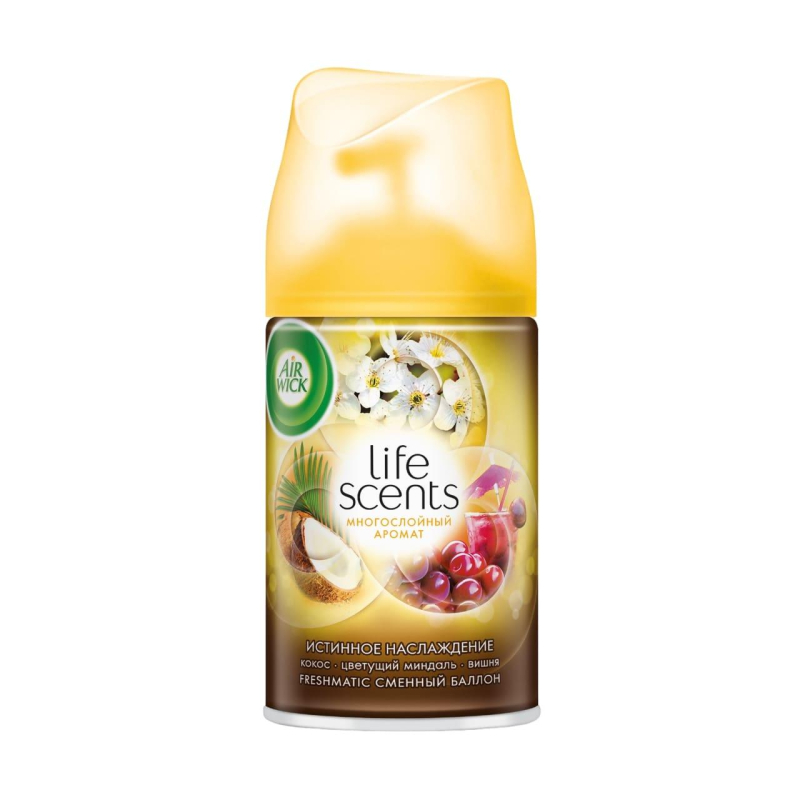 Сменный баллон для автоматического освежителя Air Wick LS Истинное наслаждение 250 мл Наслаждайтесь изысканным ароматом кокоса и цветущего миндаля в течение 70 дней вместе с аэрозольным освежителем Air Wick Истинное наслаждение. Сменный баллон освежителя воздуха поможет поддерживать в доме приятный и свежий аромат. Средство прекрасно борется с любыми нежелательными запахами. Его можно устанавливать на кухне, в ванной комнате или туалете. Аэрозоль не оставляет разводов и других следов на занавесках, мебели и других предметах. Способ применения: прочитать внимательно этикетку перед использованием и сохранить ее на весь период использования продукта. Вставить баллон в выключенный автоматический распылитель. Всегда направлять струю аэрозоля от лица. Включить - распыление начнется через 15 сек. Меры предосторожности: хранить в недоступном для детей и животных месте. Беречь от солнечных лучей, избегать нагревания выше 50°С. Беречь от источников воспламенения/нагревания/искр/открытого огня. Не курить. Не распылять вблизи открытого огня или других источников воспламенения. Не нарушать целостности упаковки и не сжигать, даже после использования. Не разбирать и не давать детям. При попадании в глаза: осторожно промыть глаза водой в течение нескольких минут. Снять контактные линзы, если Вы ими пользуетесь и, если это легко сделать. Продолжить промывание глаз. При необходимости обратиться за медицинской помощью, по возможности показать упаковку/маркировку продукта. Использовать только по прямому назначению. Не вдыхать аэрозоль. Использовать с осторожностью при повышенной чувствительности к парфюмерным отдушкам. Освежители воздуха не являются заменой надлежащих мер гигиены. Использовать только в хорошо проветриваемых помещениях. Более полная информация по безопасному обращению химической продукции находится в паспорте безопасности. Состав: 30% и более: пропеллент (смесь: Пропан, Бутан), этиловый денатурированный спирт; менее 5%: ароматизирующие добавки, в том числе бензиловый спирт, цитронеллол, кумарин, гераниол, гексилциннамаль, лимонен, линалоол. Срок годности: 24 месяца.