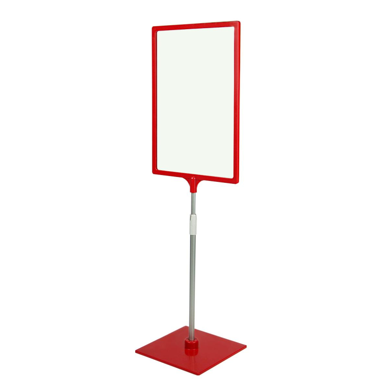 Стойка информационная напольная. Состоит из пластиковой рамки А4 красного цвета с интегрированным Т-держателем в цвет рамки, защитного антибликового кармана, алюминиевой телескопической трубки с максимальной длиной 550 мм, и пластиковой подставки в цвет рамки. Является готовым универсальным решением для размещения информационных стоек в магазинах, гостиницах, офисах, ресторанах, кондитерских, кофейнях, барах, торговых центрах. Рамку можно разместить горизонтально и вертикально.