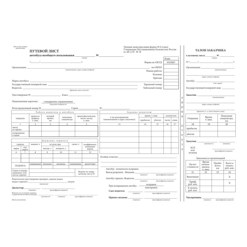 Бухгалтерский бланк Путевой лист автобуса не общего пользования формы 78. Изготовлен из офсетной бумаги плотностью 55 г/кв.м. 100 листов в книжке. Размер бланка 195x270 мм. Упакованы в термоусадочную пленку. Отсчет и запаковка бланков осуществляются на автоматическом оборудовании. В связи с этим, согласно имеющимся допускам оборудования, погрешность в количестве бланков в упаковке может составлять +/-3%. В путовом листе автобуса не общего пользования фиксируются сведения о пройденном километраже, указываются сведения о самом автобусе, времени выезда, возвращения, потраченные ГСМ и т.д.