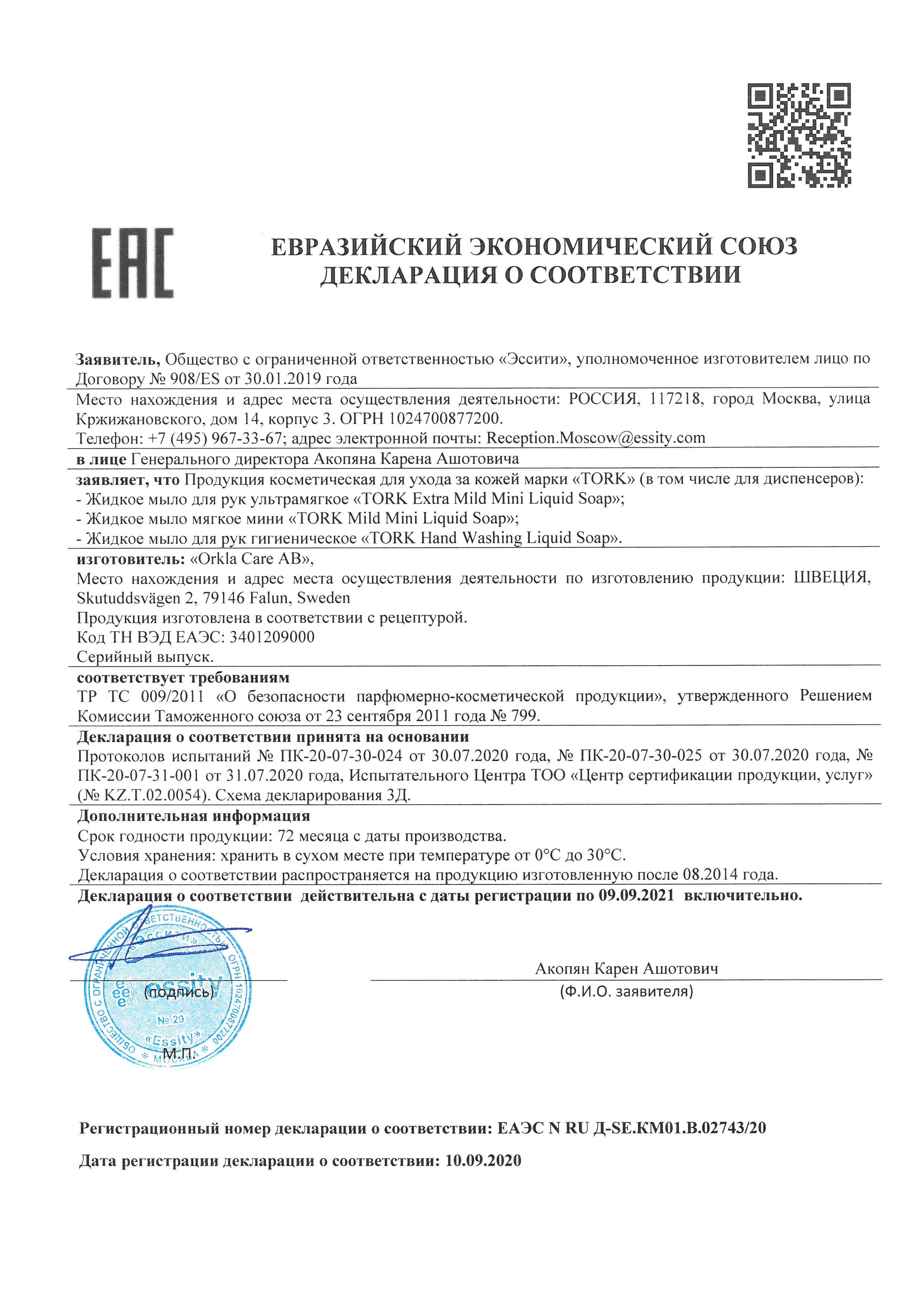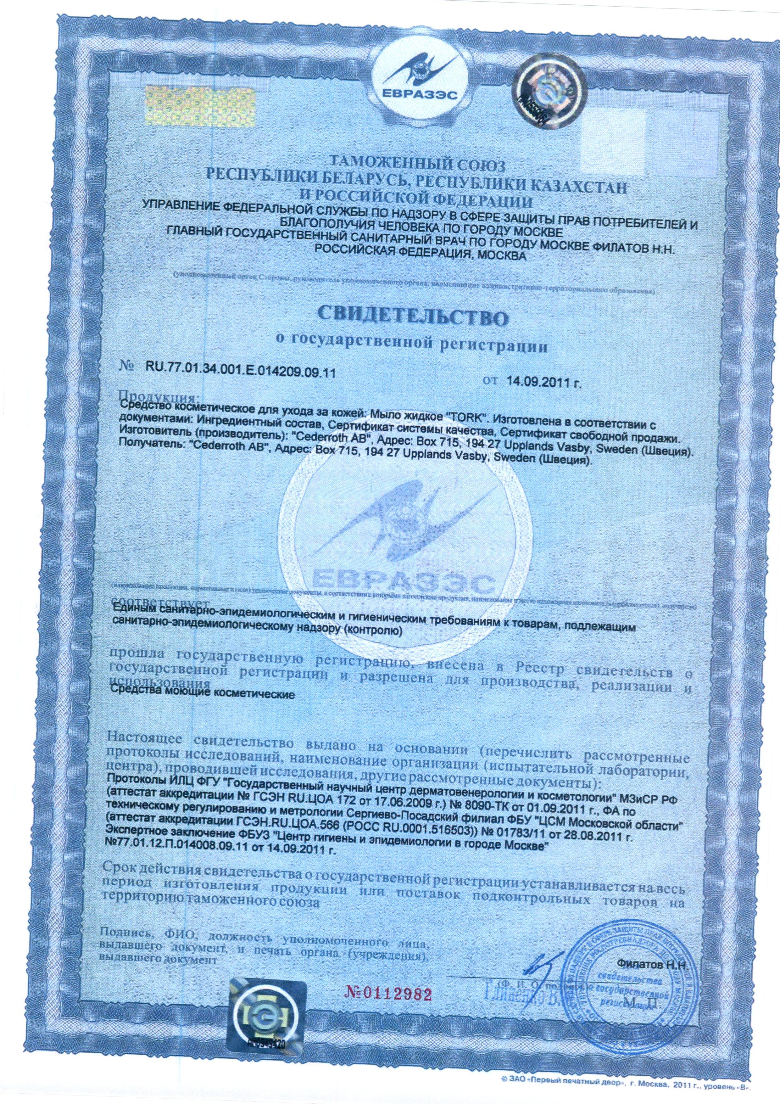 Сертификат на товар - Картридж с жидким мылом Tork S1 421501/420501 1 л