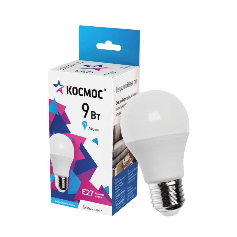 Лампа светодиодная Космос 9Вт E27 4500K 720Лм 220В. Светодиодная лампа Космос 9 Вт является аналогом лампы накаливания 75 Вт - для средней комнаты понадобится 3 таких лампочки. Стабильный свет без падения яркости в течение всего срока службы (30 000 часов) - за счет использования светодиодов известных производителей. Цвет свечения лампы - 4500 К нейтральный белый, идеально подойдет для кухни, коридора, и других зон, где требуется нейтральный свет. Преимущества Работает в диапазоне 174В-265В - не перегорит и не потеряет яркость даже при сильных скачках напряжения в сети Мгновенное включение 'Здоровый' свет без мерцания не утомляет глаза Высокий индекс цветопередачи передает естественные цвета и оттенки По размеру сопоставима с обычной лампочкой накаливания, но экономит до 90% энергии по сравнению с ней Экологически безопасна и не требует утилизации 2 года гарантии LED, повседневный Простая светодиодная лампа для ежедневного использования Применение Общее освещение Основное освещениеВнешний вид и/или характеристики товара могут быть изменены производителем в соответствии с производственным процессом.