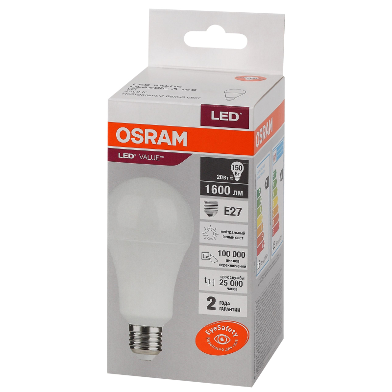Лампа светодиодная Osram LED Value A, 1600лм, 20Вт (замена 150Вт), 4000К (нейтральный белый свет). Цоколь E27, колба A, угол пучка 180°. Исполнение колбы матовое, пластик. Напряжение питания 220-240В. Товар сертифицирован.Внешний вид и/или характеристики товара могут быть изменены производителем в соответствии с производственным процессом.