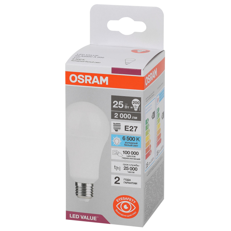 Лампа светодиодная Osram LED Value, 2000лм, 25Вт (замена 200Вт), 6500К (холодный белый свет). Цоколь E27, колба A, угол пучка 180°. Исполнение колбы матовое, пластик. Напряжение питания 220-240В. Товар сертифицирован.Внешний вид и/или характеристики товара могут быть изменены производителем в соответствии с производственным процессом.