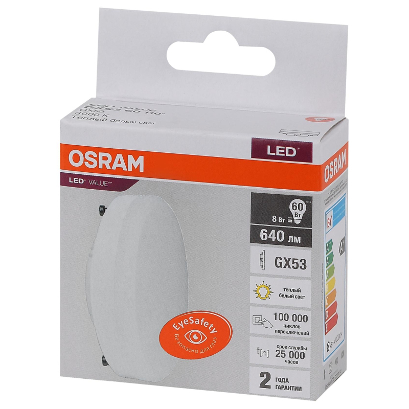 Лампа светодиодная Osram LED Value GX, 640лм, 8Вт (замена 60Вт), 3000К (теплый белый свет). Цоколь GX53, колба GX, угол пучка 110°. Исполнение колбы матовое, пластик. Напряжение питания 220-240В. Товар сертифицирован.Внешний вид и/или характеристики товара могут быть изменены производителем в соответствии с производственным процессом.