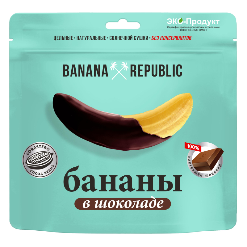Отборные спелые бананы, собранные вручную на плантациях Вьетнама и вяленые естественным образом под лучами жаркого солнца. Вяленые бананы в шоколаде являются полезным для здоровья десертом. Бананы Banana Republic - вкусный заряд жизненной энергии. Состав: банан сушеный, шоколад (сахар, тертое какао, масло какао, эмульгаторы (лецитин соевый, Е476), ароматизатор 'Ванилин'). Может содержать следы молочных продуктов, орехов и арахиса. Шоколадная масса содержит: общий сухой остаток какао - не менее 38,0%. Общее содержание какао-продуктов в шоколадной массе - не менее 38,0%. Пищевая ценность 100 г продукта (средние значения): белки - 4,0 г; жиры - 7,0 г (в том числе насыщенные жирные кислоты - 4,0 г, в том числе трансизомеры ненасыщенных жирных кислот - не более 0,1 г); углеводы - 55,0 г. Энергетическая ценность на 100 г: 300 ккал, 1260 кДж. Срок годности: 12 месяцев. Хранить при температуре (18+3)°C и относительной влажности воздуха не более 70%. Не подвергать воздействию прямого солнечного света. Вес: 180 г. Страна производства: Россия.
