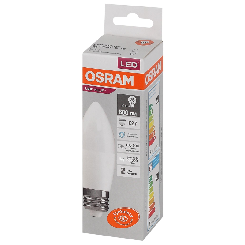 Лампа светодиодная Osram LED Value B, 800лм, 10Вт (замена 75Вт), 6500К (холодный белый свет). Цоколь E27, колба B, угол пучка 200°. Исполнение колбы матовое, пластик. Напряжение питания 220-240В. Товар сертифицирован.Внешний вид и/или характеристики товара могут быть изменены производителем в соответствии с производственным процессом.
