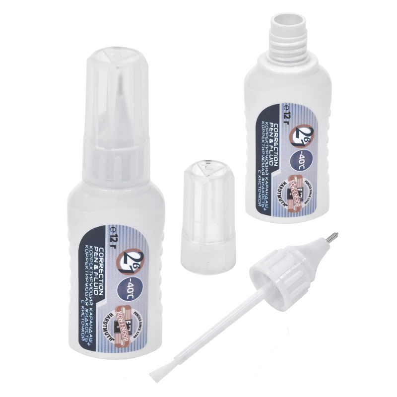 Карандаш-корректор и штрих с кисточкой используются для быстрого устранения ошибок и опечаток в документе. Тонкий металлический наконечник карандаша удобен в работе и не требует больших усилий. Кисточка штриха изготовлена из качественного волокна. Корректирующая жидкость обладает хорошей укрывистостью, быстро сохнет. Температура при транспортировке до - 40 °С. Объем: 12 мл.