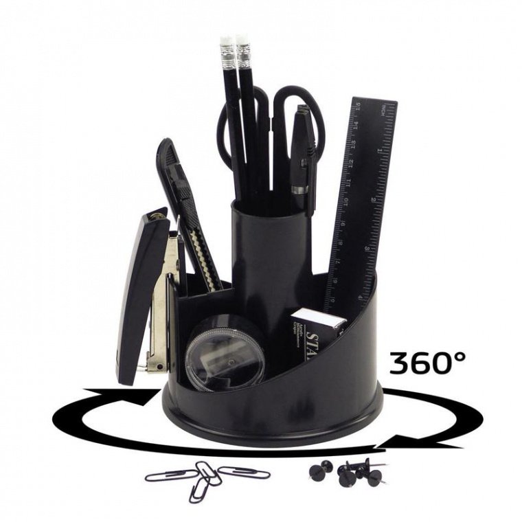Настольный набор Attache JC806 круглой формы изготовлен из черного пластика. Имеет вращающуюся на 360 градусов основу. Настольный офисный набор комплектуется (фактически 14 предметами, по наименованию 12 предметами): ножницами, двумя карандашами с ластиком, канцелярским ножом, двумя шариковыми ручками, ластиком, линейкой, скобами для степлера № 10, точилкой, степлером № 10, силовыми кнопками, скрепками и подставкой. Всего 14 предметов. Размер изделия без наполнения (ДxШxВ) - 117x117x115 мм. Размер изделия с наполнением (ДxШxВ) - 117x117x200 мм.