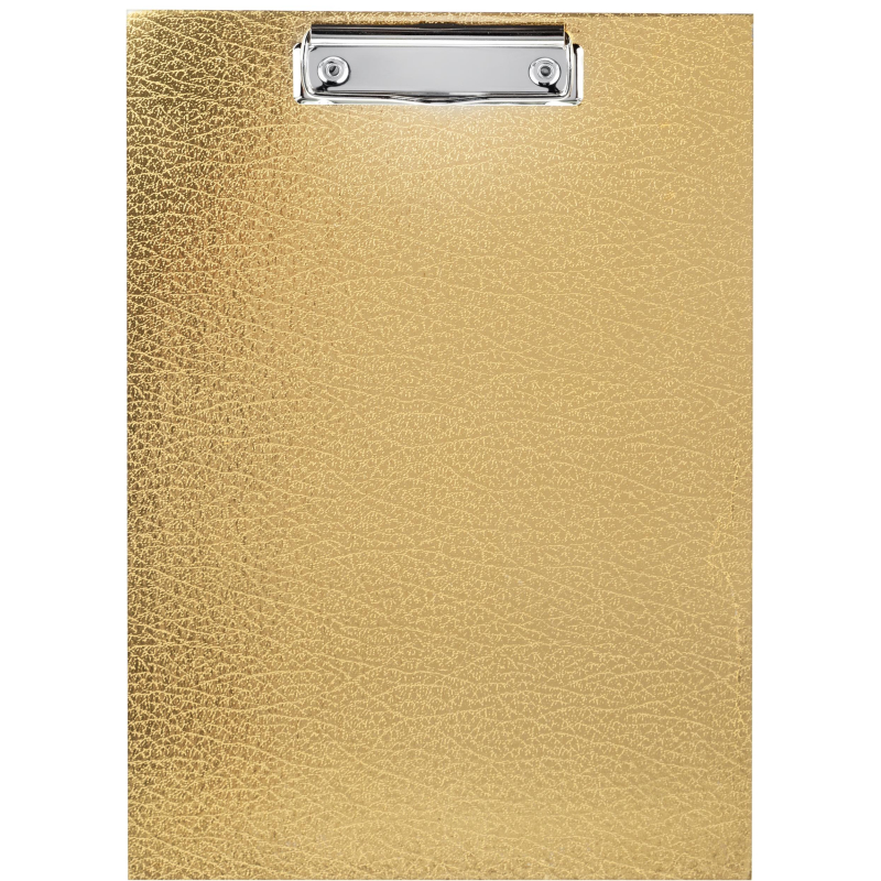 Папка-планшет формата А4 (220x315 мм) изготовлена из плотного картона, обклеенного бумагой золотистого цвета с фактурой под кожу. Позволяет комфортно работать с документами на весу. Металлический прижим надежно удерживает листы и файлы. Вместимость до 75 листов. Без крышки.