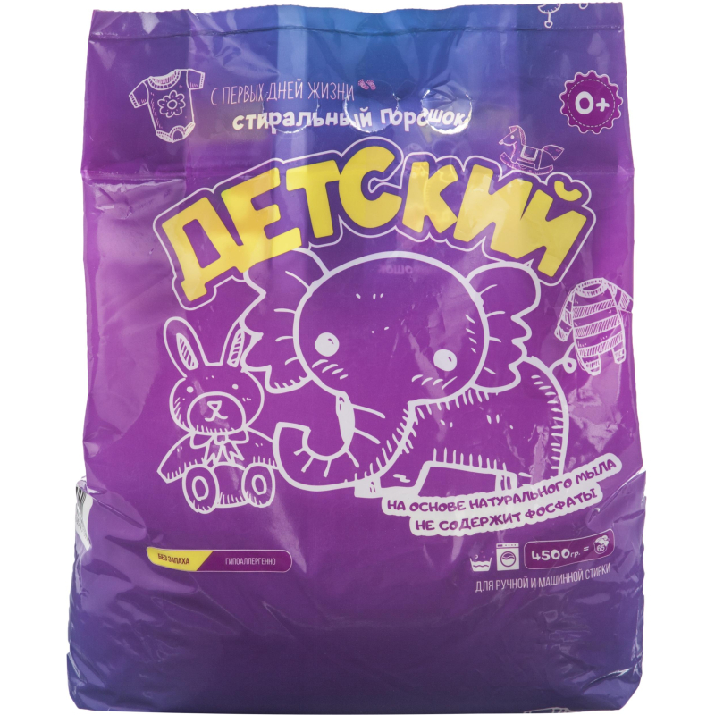 Порошок стиральный концентрированный автомат Детский 4.5 кг (для детского белья) Назначение: стиральный порошок для детского белья разработан специально для заботы о детской одежде и постельном белье. Рекомендован для малышей с первых дней жизни. Предназначен для замачивания, ручной стирки и стирки в автоматических стиральных машинах детского белья из хлопчатобумажных, льняных, синтетических тканей и тканей из смешанных волокон. Эффективно отстирывает даже самые сложные пятна и не разрушает структуру ткани. Современный состав порошка абсолютно безопасен для кожи и не вызывает раздражения даже при попадании на слизистые оболочки. Обладает безопасным составом, не содержит фосфатов, хлора и прочих агрессивных компонентов. Полностью выполаскивается из тканей. Предотвращает деформацию и усадку тканей. Подходит для малышей с первых дней жизни. Безопасный биоразлагаемый состав. Не вызывает аллергии и раздражения. Подходит для стирки одежды людей с чувствительной кожей. Способ применения: сортируйте белье по цветам. Мерный стакан: 200 мл./150-200 г. Машинная стирка: Мягкая вода: слабое загрязнение - 140 мл, среднее загрязнение - 160 мл, сильное загрязнение - 180 мл; Средней жесткости: слабое загрязнение - 150 мл, среднее загрязнение - 170 мл, сильное загрязнение - 190 мл; Жесткая вода: слабое загрязнение - 170 мл, среднее загрязнение - 200 мл, сильное загрязнение - 230 мл; Ручная стирка: слабое загрязнение - 100 мл, среднее загрязнение - 110 мл, сильное загрязнение - 120 мл. После стирки изделие тщательно прополоскать Меры предосторожности: хранить вдали от пищевых продуктов, в недоступном для детей месте. При попадании средства в глаза - промыть большим количеством воды. При повышенной чувствительности и повреждениях кожи следует избегать длительного контакта с моющим раствором. Состав: анионные ПАВ 5-15 %, неионогенные ПАВ менее 5 %, кислородосодержащий отбеливатель, поликарбоксилаты, мыло, энзимы, отдушка. Условия хранения: предохранять от воздействия прямых солнечных лучей и нагревания св##ше 35°С. Хранить при относительной влажности воздуха не более 95%. Срок годности: 24 месяца с даты изготовления. Относится к сегменту "суперэконом" - товар с минимальными требованиями к качеству для тех, кто хочет сэкономить. Товар отвечает основным потребительским характеристикам.