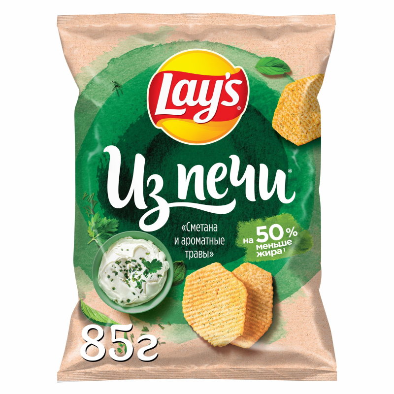 Запеченные Lays 'Из Печи' со вкусом 'Сметана и ароматные травы' такие вкусные и хрустящие! Запекаются, а не обжариваются. Содержат на 50% меньше жира. Яркий и насыщенный вкус благодаря специям и натуральным травам. Аппетитный хруст. Состав: картофельные хлопья [картофель, эмульгатор (моно- и диглицериды жирных кислот), декстроза, стабилизатор (дигидропирофосфат натрия), регулятор кислотности (лимонная кислота)], кукурузный крахмал, растительное масло, комплексная пищевая добавка [мальтодекстрин, порошок молочной сыворотки, соль, порошок чеснока, усилители вкуса и аромата (глутамат натрия 1-замещенный, 5'-рибонуклеотиды натрия 2-замещенные), порошок лука, агент желирующий (хлорид калия), травы (петрушка, укроп, мята), порошок йогурта, вкусоароматические вещества, регулятор кислотности (яблочная кислота)], мука пшеничная, сахар, эмульгатор (лецитины), разрыхлители (орто-Фосфат кальция 1-замещенный, гидрокарбонат натрия), краситель (куркумин). Пищевая ценность: белки - 5.5 г; жиры - 16 г; углеводы - 69 г. Энергетическая ценность: 440 ккал. Хранить продукт при температуре воздуха не выше 25°С и относительной влажности воздуха не более 75%. После вскрытия упаковки хранить продукт не более суток при температуре воздуха не выше 25°С и относительной влажности воздуха не более 75%. Вес: 85 г.