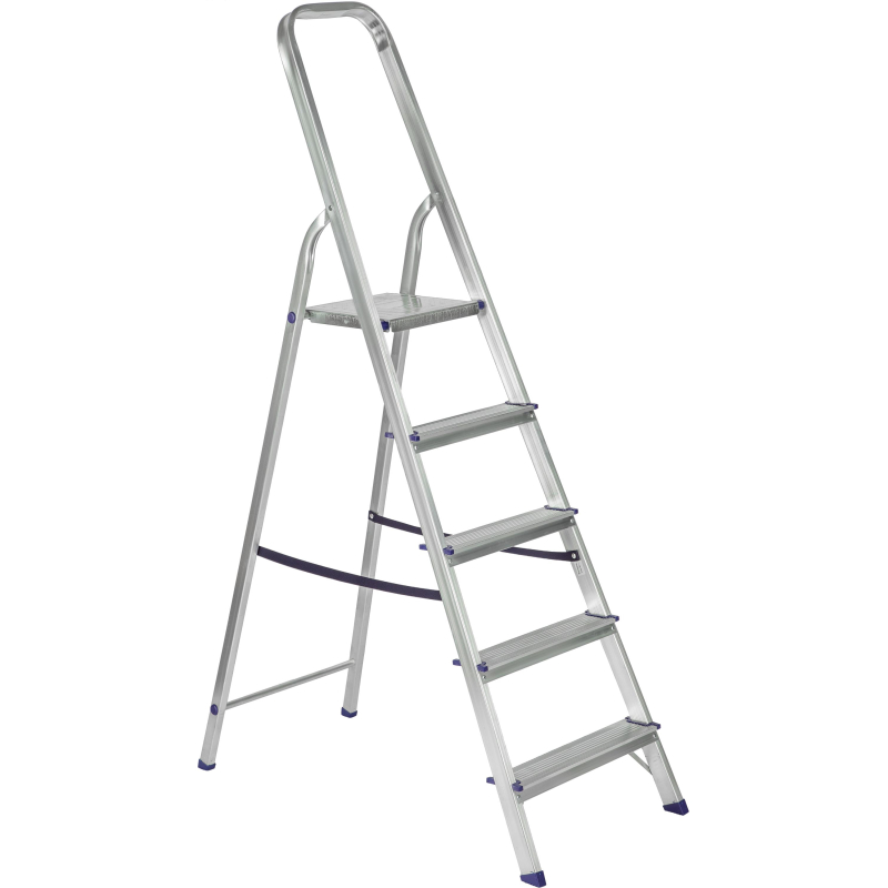 Стремянка алюминиевая 5 ступеней Topfort. Стремянка представляет собой свободностоящую переносную лестницу, сужающуюся к верху, имеющую сторону подъема (переднюю ногу), опорную сторону (заднюю ногу), рабочую площадку и раскладывающуюся для выполнения определенной задачи. Дуга безопасности конструктивно выполнена совместно со стороной подъема. Стремянка алюминиевая изготовлена из высокопрочного алюминиевого профиля. Задняя и передняя нога соединены между собой. Рабочая площадка выполнена из оцинкованной стали. Ступени имеют рифленую поверхность. Башмаки изготовлены из высокопрочного пластика. Стремянка в рабочем положении надежно фиксируется рабочей площадкой. Стремянка предназначена для проведения различных видов работ на высоте до 4 м как в быту, так и на производстве. Необходимо отметить, что производство стремянок удалась автоматизировать, что исключило влияние 'человеческого фактора' на качество продукции. При этом стремянки приобрели дополнительную прочность, возросла их надежность и долговечность.Внешний вид и/или характеристики товара могут быть изменены производителем в соответствии с производственным процессом.