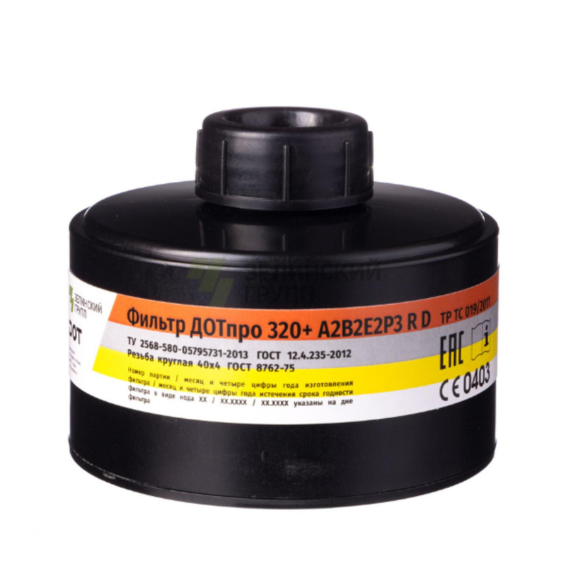 Фильтр ДОТпро 320+ А2В2Е2Р3 R D. Комбинированный фильтр в полимерном корпусе с резьбовым соединением. Обладает увеличенным временем защитного действия по сероводороду и аммиаку.Применяется в комплекте противогаза промышленного фильтрующего ДОТпро. Степень защиты: А2В2Е2Р3 R D. Рекомендации по использованию: для защиты органов дыхания от воздействия органических газов и паров с температурой кипения выше 65° С, неорганических и кислых газов и паров, аэрозолей. Страна происхождения: Россия. Стандарты: ТР ТС 019/2011, ГОСТ 12.4.235-2012, ГОСТ 12.4.235 2019, EN 14387.