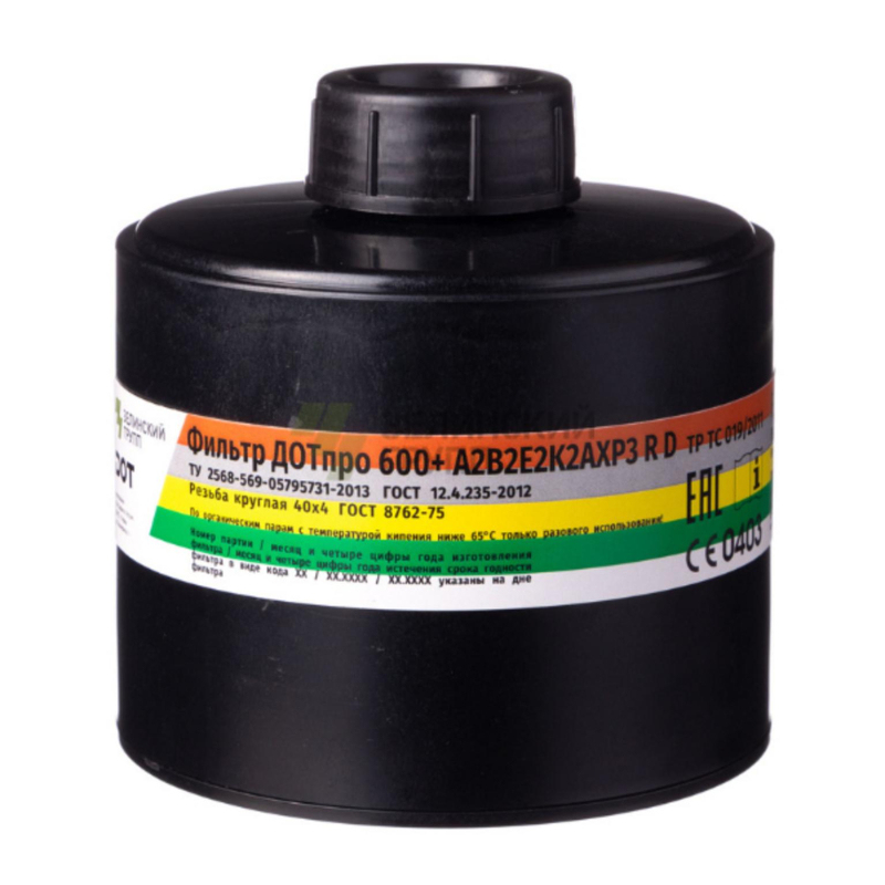 Фильтр ДОТпро 600+ А2В2Е2К2АХР3 R D. Комбинированный фильтр в пластмассовом корпусе с резьбовым соединением. Обладает время защитного действия по циклогексану, хлору, циановодороду, сероводороду, аммиаку. Степень защиты: А2В2Е2К2АХР3 R D. Рекомендации по использованию: для защиты от органических паров с температурой кипения выше 65° С, органических газов и паров с температурой кипения ниже 65° С, неорганических и кислых газов и паров, аммиака и его органических производных, аэрозолей. Страна происхождения: Россия. Стандарты: ТР ТС 019/2011, ГОСТ 12.4.235-2012, ГОСТ 12.4.235-2019, EN 14387:2001+А1:2008.