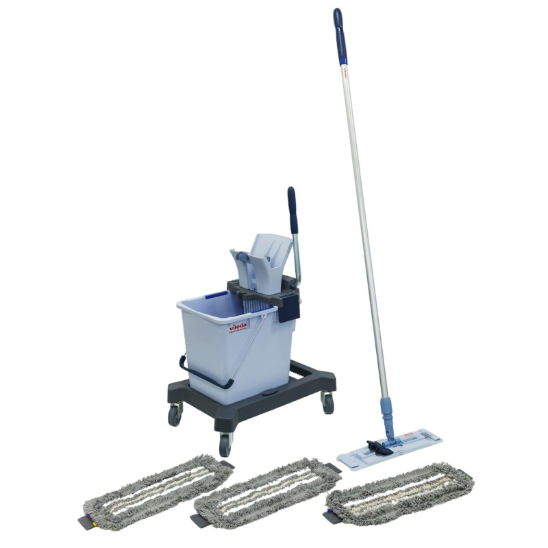Комплект для уборки Vileda Professional Необходимый минимум с УльтраСпид Про предназначен для влажной уборки следующих помещений до 300м? (офис, салон красоты, магазин, супермаркет, аптека, заправка, мультисервис, салон связи, тренажерный зал, спортклуб, подъезды жилого многоквартирного дома, и пр.) В состав набора входит: ведро 25 л, туннельный отжим, рычаг, платформа на колесах, держатель МОПов УС Про 40 см, ручка алюминиевая 150 см с цветовой кодировкой, 3 МОПа Трио 40 см. Швабра Плоский держатель имеет поворотный шарнирный механизм для удобства уборки стен и потолков. Благодаря широкой усиленной педали держатель легко складывается при надавливании ногой и надежно фиксируется в рабочем состоянии. Материал держателя - полипропилен. Еврокрепление с Э-клипсой. Размер держателя - 40х10 см. Ручка алюминиевая длиной 150 см. с цветовой кодировкой Универсальный МОП Трио УльтраСпид Про стойкий к износу и надежный МОП для любых твердых напольных покрытий. Подметает, моет и впитывает. Плотная основа и окантовка, двойная прошивка увеличивает срок службы МОПа. Надежный тафтинг: петли МОПа держат форму, не скатываются и не распускаются в процессе уборки. 4-цветная кодировка для исключения перекрестного загрязнения. Крепление на ремнях, подходит для туннельного отжима система УльтраСпид Про. Размер МОПа - 42x14,5 см, материал насадки - микроволокно/хлопок. Насадку можно стирать в стиральной машинке при температуре 60°C и без использования кондиционера, ополаскивателя и сильных отбеливателей. Ведро: Объем ведра - 25 л. Размер ведра: длина - 37, ширина - 28, высота - 36. Вес- 1,220 гр. Материал - полипропилен 100%. Ручка - нержавеющая сталь. Эргономическая прочная ручка для переноски, широкий сливной носик и углубление на дне для удобного слива. Мерная шкала на 25 л на внутренней стенке ведра. Возможность смены клипс цветного кодирования для исключения перекрестного загрязнения. Цвет ведра: серо-голубой Цвет отжима: серо-голубой Туннельный отжим УльтраСпид Про с рычагом, легко и прочно крепятся на ведро Vileda Professional. Встроенные фиксаторы позволяют эргономично закрепить ручку с держателем в ведре. Увеличенная спинка позволяет легко вставлять насадку в отжим. Удобная фиксация и снятие отжима после уборки. Рекомендации по использованию иуходу: МОПы после уборки стирать в стиральной машине при температуре 60°C. Высушивать их после стирки. Своевременно заменять расходные материалы: 1 МОП через 3 месяца. В случае ручной стирки или несоблюдения рекомендаций срок службы может быть меньше указанного. Пластиковый инвентарь после использования промыть под проточной водой и протереть салфеткой насухо. Использовать цветовую кодировку согласно рекомендациям. Вес комплекта: 5 800 гр.