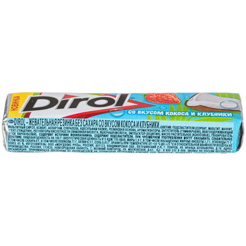 Жевательная резинка Dirol со вкусом кокоса и клубники надолго освежает дыхание, не содержит сахара. В коробке 30 упаковок по 13.6 г. Состав: подсластители (сорбит, мальтит, маннит, мальтитный сироп, ксилит, аспартам, сукралоза, ацесульфам калия), резиновая основа, ароматизаторы, загуститель (гуммиарабик), влагоудерживающий агент (глицерин), регуляторы кислотности (лимонная кислота, яблочная кислота), эмульгатор (лецитин), масло растительное (кокосовое), глазирователь (воск карнаубский). Срок годности: 60 месяцев. Хранить при температуре от 10°С до 25°С, относительной влажности воздухе не выше 65%.