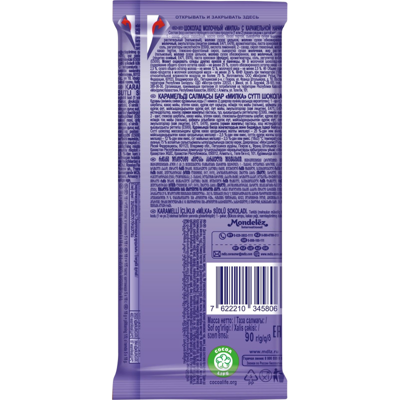 Шоколад молочный Milka с карамельной начинкой, 90 г. Milka с карамельной начинкой подарит вам настоящее удовольствие. Тягучая карамель в сочетании с молочным шоколадом создают восхитительный вкус, который запомнится с первого кусочка. Milka - нежность внутри! Пищевая ценность: белки 3.9 г, жиры 24 г, углеводы 62 г Энергетическая ценность: 481 ккал. Срок годности: 9 месяцев. Хранить при температуре от 15°С до 21°С, относительной влажности воздухе не выше 75%. Страна производства: Россия.