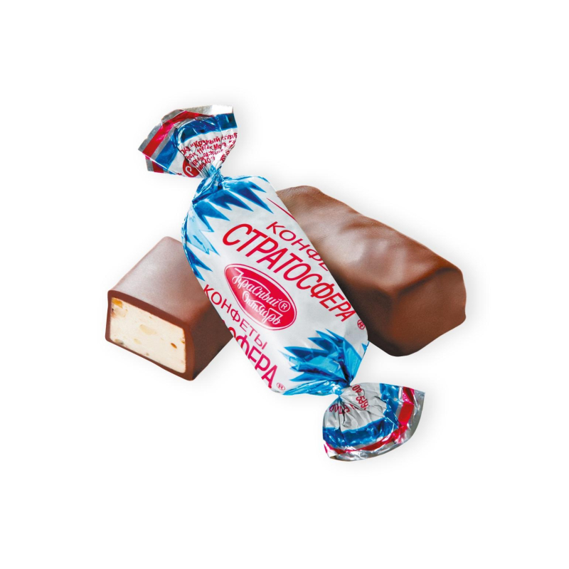 Конфеты 'Стратосфера' - одни из тех, которые называют легендарными. Со времен СССР их оформление и вкус ничуть не изменились: все то же нежное суфле в котором, как осколки метеоритов в пушистых облаках, утоплены кусочки дробленых миндальных орехов. Стройный кирпичик конфеты покрыт щедрым слоем шоколадной глазури. Состав: шоколадная глазурь (сахар, какао тертое, эквивалент масла какао (рафинированные, дезодорированные, фракционированные, негидрогенизированные растительные масла (пальмовое, ши)), какао-порошок, эмульгаторы: лецитин соевый, Е476; ароматизатор 'Ваниль'), сахар, вода питьевая, патока, пюре абрикосовое (абрикосы, консервант - диоксид серы), ядро ореха миндаля дробленое, желирующий агент - агар, белок сухой яичный, ароматизатор натуральный 'Ром'. Противопоказано при индивидуальной непереносимости яичного белка. Возможно наличие незначительного количества фундука. Пищевая ценность на 100 г продукта, г: белки 2,5; жиры 14,0; углеводы 66,0. Энергетическая ценность: 410 ккал. Срок годности: 4 месяца. Хранить при температуре от 15°С до 21°С и относительной влажности не более 75%. Масса нетто: 3 кг. Страна происхождения: Россия.