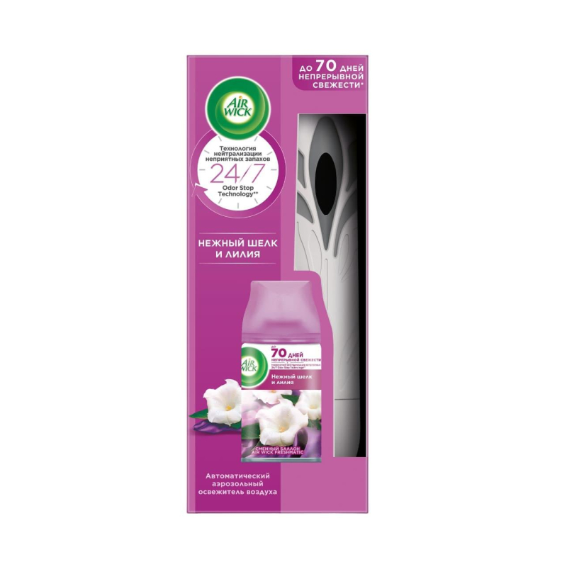 Автоматический освежитель воздуха Air Wick Freshmatic+сменный балон Нежный шелк и лилия 250 мл Назначение/особенности: Автоматический освежитель воздуха Air Wick Freshmatic - это небольшое стильное устройство, которое автоматически борется с неприятными запахами день за днем. Аромат 'Нежный шелк и лилия' наполнит Ваш дом изысканными нотками цветущей лилии и нежного шелка. Вставьте сменный баллон в элегантное устройство, выберите интенсивность распыления и наслаждайтесь утонченным ароматом Air Wick, разработанным парфюмерными домами Европы. До 70 дней непрерывной свежести. Удобно вешать на стену, размещать на полке или ставить на шкаф. Нормальное функционирование автоматического распылителя гарантировано при использовании сменного баллона Air Wick Freshmatic. Материал корпуса - пластик, цвет - белый. Габаритные размеры - 193х80х80 мм. Состав набора: - Автоматический распылитель воздуха. - Сменный баллон 'Нежный шелк и лилия'. - 1 батарейка АА. Способ применения: Снимите верхнюю часть изделия, потянув крышку вверх. Переключите контроллер на позицию 'Выкл.', как показано на рисунке. Откройте верхнюю часть изделия. Вставьте сменный аэрозольный баллон в нижнюю часть изделия. Закройте изделие, соединив верхнюю и нижнюю части и повернув верхнюю часть по часовой стрелке. Вставьте 1 аккумуляторную батарею АА согласно символам (+) и (-). Установите уровень интенсивности распыления ароматизирующего вещества на контроллере. Не направляйте изделие в лицо. Распыление начнется автоматически через 15 секунд. Максимальная площадь ароматизируемого помещения - 10 м? Меры предосторожности: Беречь от солнечных лучей, избегать нагревания выше 50°С. Беречь от источников воспламенения/нагревания/искр/открытого огня. Не курить. Не распылять вблизи открытого огня или других источников воспламенения. Не нарушать целостности упаковки и не сжигать, даже после использования. Не разбирать и не давать детям. При попадании в глаза: Осторожно промыть глаза водой в течение нескольких минут. Снять контактные линзы, если Вы ими пользуетесь и, если это легко сделать. Продолжить промывание глаз. При необходимости обратиться за медицинской помощью, по возможности показать упаковку/маркировку продукта. Использовать только по прямому назначению. Не вдыхать аэрозоль. Использовать с осторожностью при повышенной чувствительности к парфюмерным отдушкам. Освежители воздуха не являются заменой надлежащих мер гигиены. Использовать только в хорошо проветриваемых помещениях. Более полная информация по безопасному обращению химической продукции находится в паспорте безопасности. Состав баллона: 30% и более: пропеллент (смесь: Пропан, Бутан), этиловый денатурированный спирт; менее 5%: ароматизирующие добавки, в том числе бензилсалицилат, цитраль, гексилциннамаль, лимонен, линалоол. Условия хранения: Хранить в недоступном для детей и животных месте. Срок годности: 24 месяца.