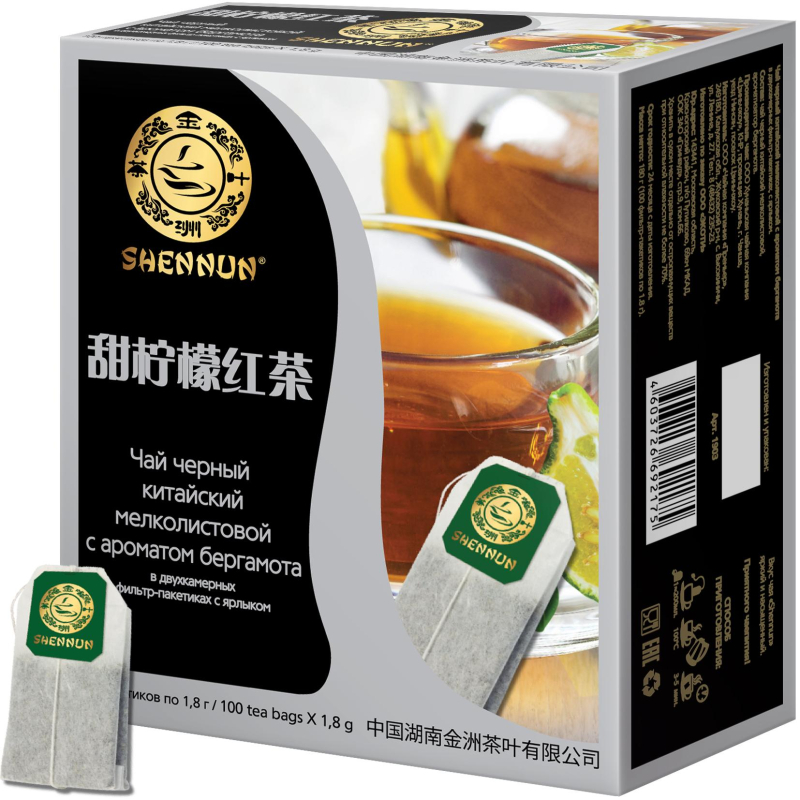 Чай черный мелколистовой с ароматом бергамота ТМ "Shennun" - знаменитый китайский чай, завоевавший весь мир. Название марки "Шень Нун" (Shennun) - имя легендарного "Божественного земледельца", который оставил человечеству в наследство многие исцеляющие рецепты из трав и корней, именно он подарил цивилизации свое величайшее изобретение - чай. Чай выращен на природных плантациях округа Цзиньчжоу, где "Божественный земледелец" впервые открыл замечательные свойства этого напитка. Как гласят легенды, от произнесения одного имени Шень Нун к людям возвращалась сила. Состав: чай 75% черный мелколистовой китайский, 15% цедра лимона, ароматизатор натуральный пищевой "бергамот". Способ приготовления: положить 1 пакетик в чашку 200 мл, залить кипяченной водой 70°С- 80°С и дать настояться 3-5 минут. Масса нетто: 180 г (100 бумажных двухкамерных фильтр-пакетиков с ярлыком по 1,8 г). Тип упаковки: картонная. Условия хранения: хранить в сухом месте отдельно от остро пахнущих веществ при относительной влажности не более 70%. Страна происхождения: Китай.