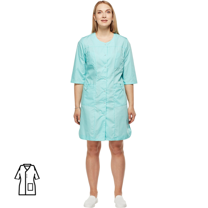 Халат медицинский женский морская волна М20 ХЛ (размер 48-50, рост 170-176). Униформа рекомендована для сферы красоты и здоровья: медицинские учреждения, центры. Халат медицинский женский м20-ХЛ цвета морская волна без воротника с круглым вырезом горловины. Халат с полуприталенным силуэтом изготовлен из смесовой ткани Ти-Си плотностью 115 г/кв.м, состоящей на 65% из полиэфира и на 35% из хлопка. Не мнется, легко и быстро стирается, быстро сохнет. Долго сохраняет свой первоначальный яркий цвет. Ткань 'дышит', благодаря входящему в состав хлопку, имеет повышенный срок службы и проста в уходе, благодаря полиэфиру. Застежка центральная, на кнопках; на лицевой стороне расположены четыре кармана, на спинке хлястики для регулировки объема по талии. Размер халата - 48-50 при росте модели от 170 до 176 см.