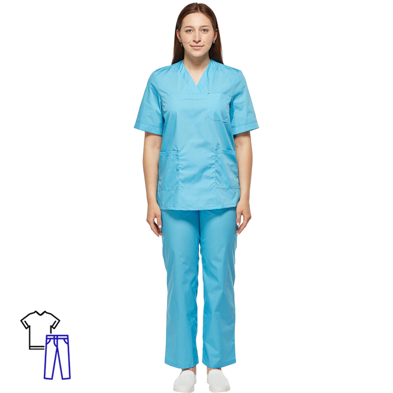 Костюм хирурга женский м05-КБР голубой (размер 44-46, рост 170-176). Униформа рекомендована для сферы красоты и здоровья: медицинские учреждения, центры. Костюм хирурга женский м05-КБР голубого цвета состоит из блузы и брюк. Модель изготовлена из смесовой ткани Ти-Си плотностью 115 г/кв.м, состоящей на 65% из полиэфира и на 35% из хлопка. Не мнется, легко и быстро стирается, быстро сохнет. Долго сохраняет свой первоначальный яркий цвет. Ткань 'дышит', благодаря входящему в состав хлопку, имеет повышенный срок службы и проста в уходе, благодаря полиэфиру. Блуза прямого покроя с V-образным вырезом горловины, на лицевой стороне расположены три накладных кармана., рукава короткие. Брюки прямого покроя на резинке. Размер костюма 44-46 при росте модели от 170 до 176 см.